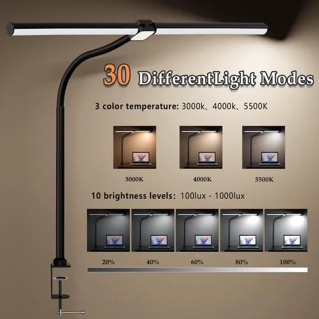 Multi-Function Desk Lamp: This LED desk light offers 30 lighting effect combinations, including 3 color temperatures (3000K5500K) and 10 brightness levels (10%100%), making it suitable for various needs such as work, study, reading, or leisure activities. Enjoy optimal illumination tailored to your needs.