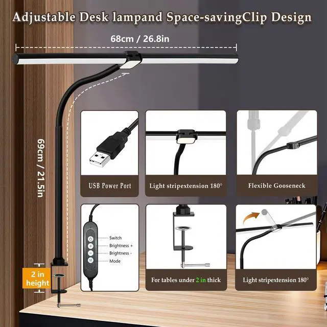 Adjustable Desk Lamp for Home Office: Equipped with a 360° flexible gooseneck, 180° adjustabl arm, and 270° rotatable lamp head, it can be easily adjusted to any desired angle. Its wide lighting coverage ideal for tasks such as work, reading, studying, and crafting.