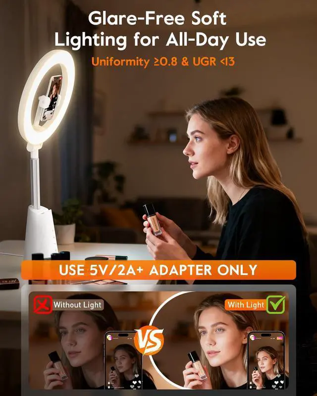 ATTENTION PLEASE: To ensure your Halluv Ring Light works perfectly without flickering or failure to turn on, use a 5V/2A power adapter ONLY. DO NOT plug into a computer USB port! Insufficient power may cause flickering or abnormal function. For optimal performance, always use the correct power supply.