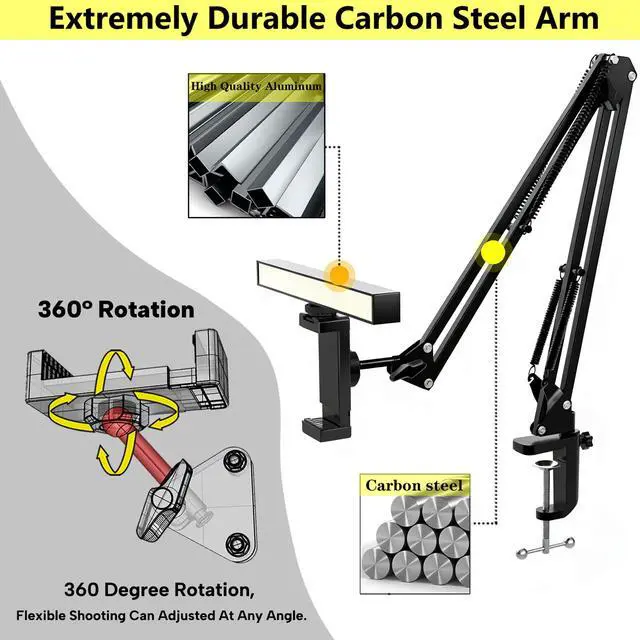 New DesignCombines an adjustable arm with a USB selfie light for Versatile Use. Offers 10 brightness levels: 15 for selfies and streaming, 610 for video recording. Compared to portable rechargeable lights, it stays bright longer without frequent charging. More compact than ring lights and easy to store