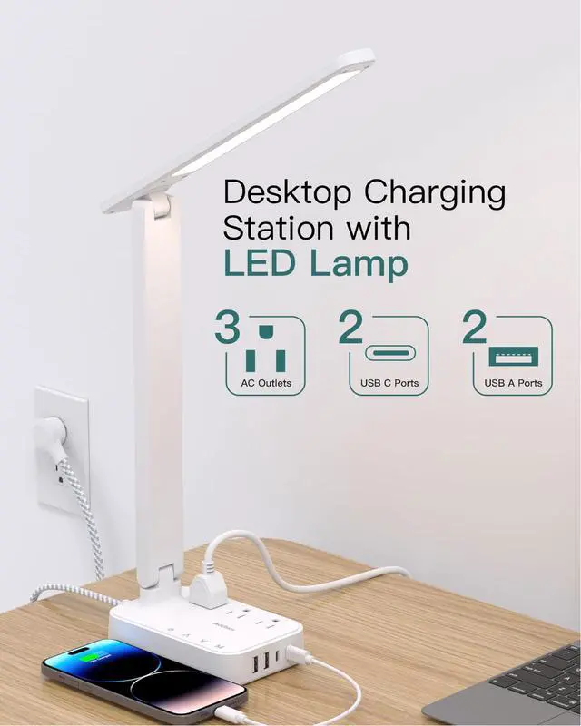 Deskop Power Strip with USB Ports - The small desk lamp for college dorm room is also equipped with 2 USB-C port, 2 USB-A ports and 3 3-prong AC outlets, making your phone, tablet, kindle, watch, humidifier and other electronic devices are charged whether the lamp is on or off, building your own working station. Fully save your time and space