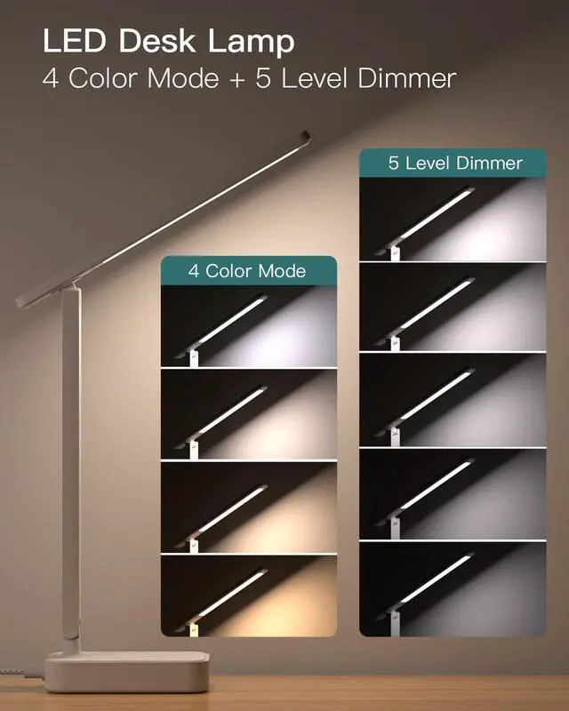 LED Desk Lamp - Features 4 color temperatures and 5 adjustable brightness with 6500k illumination, enabling you to customize the light you want. This desk light can be easily controlled by the integrated touch buttons. It can be used as an ambience lamp, reading lamp, nail lamp, night light, study lamp, desk lamp for home office, bedroom, college dorm room, living room and gaming room
