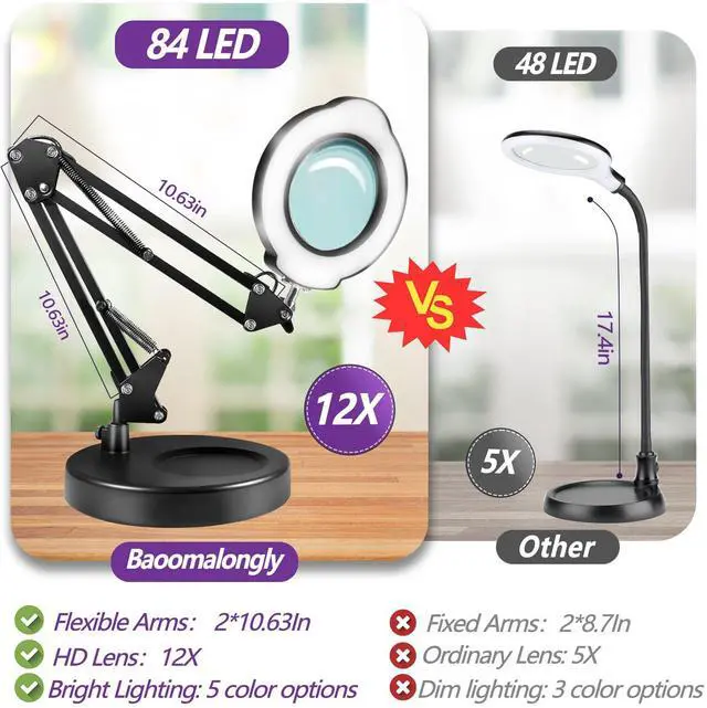More Clear 12X Multiples LED Desk Lamp The magnifier with light hands free is Newly upgraded high-definition optical lens to 1000% magnification, more effective and realistic auxiliary reading, engineering maintenance, manual production, viewing instructions, etc. The lens contains 84 PCS LED Chips, which can provide more uniform light and will not cause dizziness.