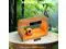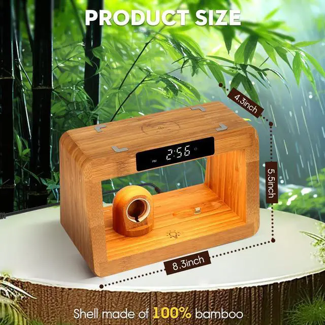 Summarize and organize a wooden table lamp with an alarm clock that can be charged at the same time