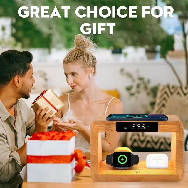 Multi-scene dimming, touch alarm clock, wooden desk lamp, 3 lighting modes, can be used for mobile phones, watches, headphones charging, easy to summarize and tidy the countertop, saving space, safer and more convenient