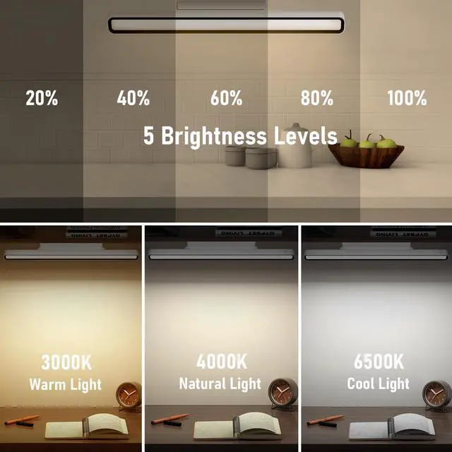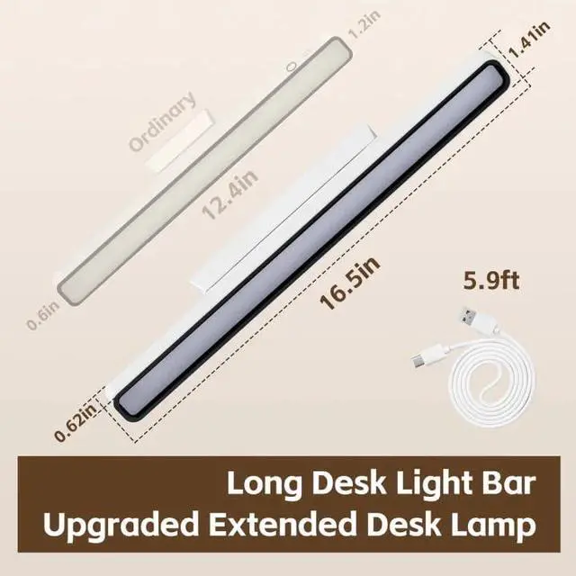 Three color temperatures, ambience as you wish This LED desk light bar can switch between 3000K warm light/4500K natural light/6000K cool white light at the touch of a button to meet the needs of multiple scenarios.The 16.5-inch extended body provides a wider lighting area, and with stepless dimming design, you can precisely adjust the brightness with a touch of the control area, and the light is soft and not harsh, which is conducive to creating a comfortable lighting atmosphere.