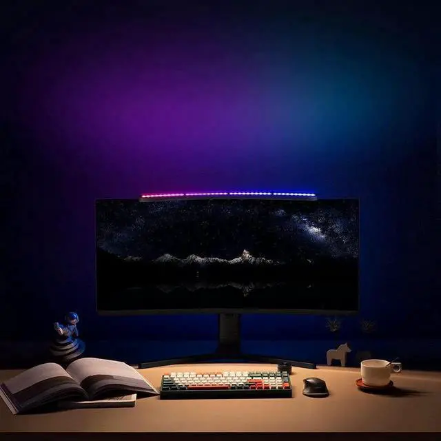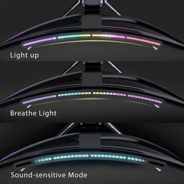 The top of the monitor lamp on the curved screen bar is equipped with RGB backlight, which can provide three lighting modes powered by 40 RGB lamp beads: light on, breathing light, and phonoreception mode can be automatically adjusted to the environment. The built-in algorithm of the device makes the light possible Realize the synchronization with the change of the audio rhythm to achieve the effect of the atmosphere light. This is a unique feature, currently no other screen lights can do it!