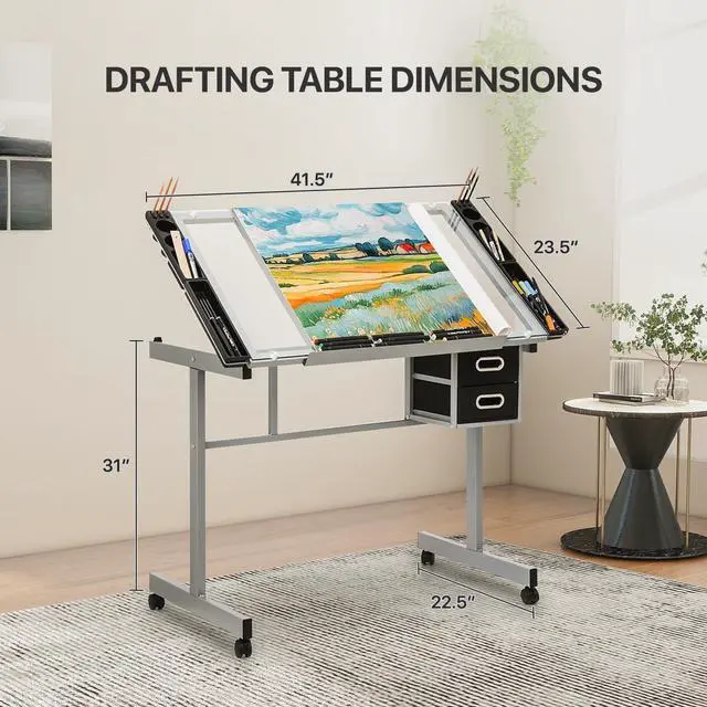 Athena Collection 41" Drafting Table Adjustable Angle Drawing Table Tempered Glass Art Desk Metal Frame Craft Desk for Artist with Fabric Drawers, Rolling Casters and Trays, Light Grey