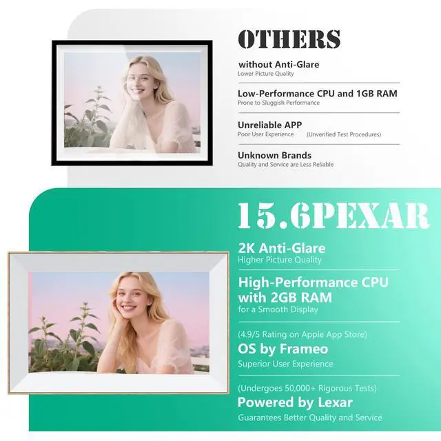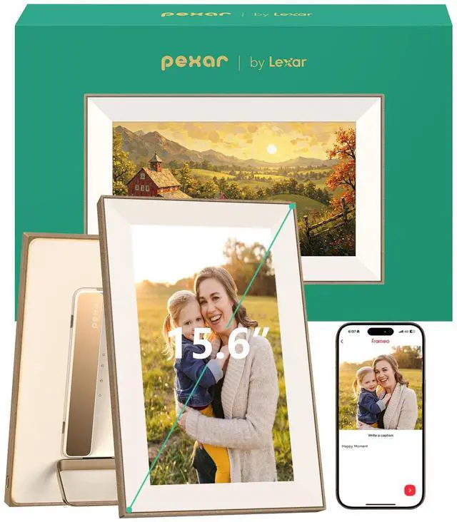 The pexar by Lexar 15.6" WiFi Digital Picture Frame lets you easily share and display photos and videos from your smartphone using a free app. It features a 1280×1080 anti-glare touchscreen with auto-rotation and includes 64GB built-in storage for offline viewing. Simple to set up and easy to use, it is ideal for everyday home display or gifting.