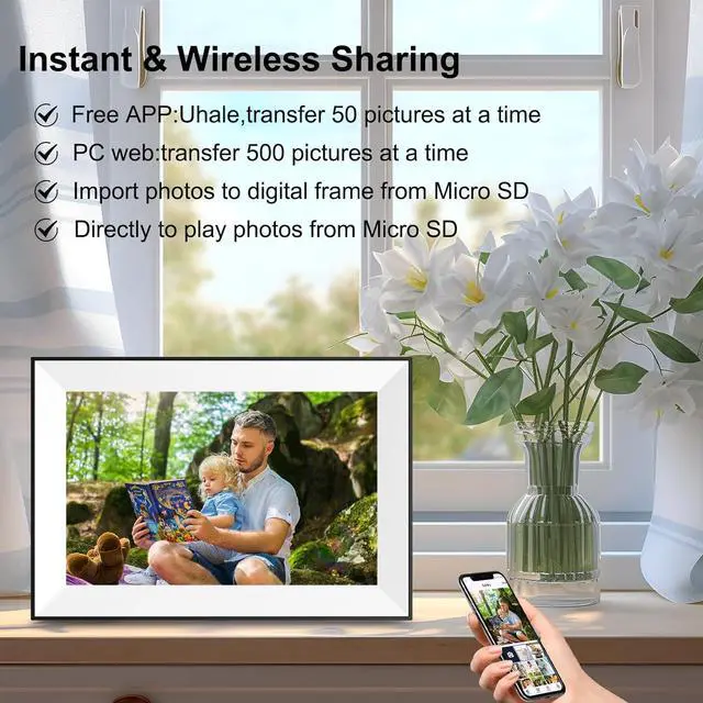 : With 16GB of built-in storage, digital picture frame can hold up to 50, 000 photos! Additionally, you can simultaneously transfer photos to multiple smart picture frame. Moreover, you can easily back up pictures to micro SD card (up to 32GB) directly from digital frame, freeing up smart phone memory and ensuring your memories are securely preserved for the long term