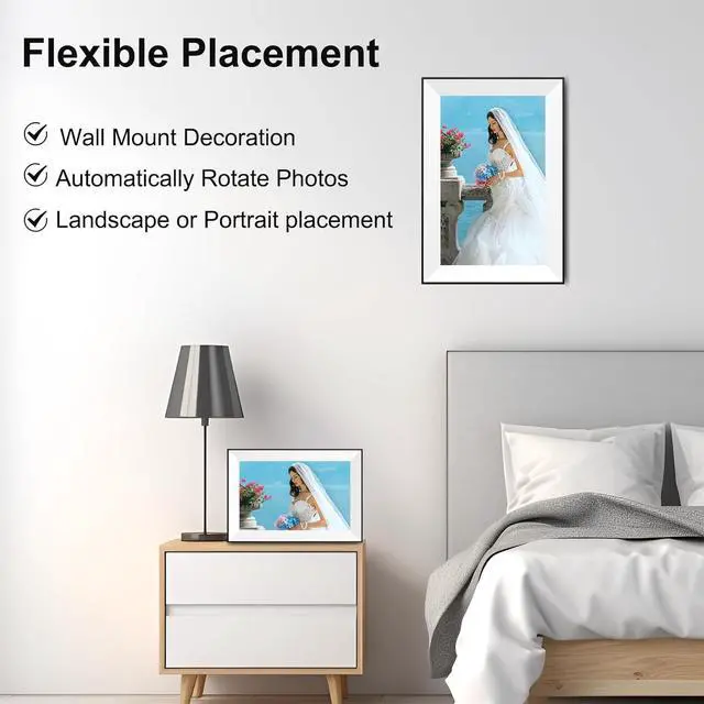 - & -: Our digital picture frame boasts a clever auto-rotate function. Whether its on a desk or hanging on a wall, it adjusts the photo orientation automatically. No fiddling required! Your memories will stay crystal clear