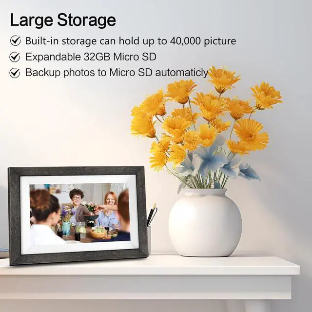 LARGE STORAGE: The wifi digital picture frame has a built-in 16GB memory, it can receive photos(up to 40000+) and videos (15s) from loved ones worldwide via 2.4G wifi (only). It also supports directly playing or importing photos from