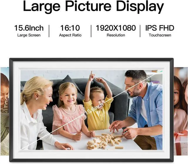 Top WIFI digital photo frame configuration: 15.6 -inch digital photo frame is equipped with 1920*1080 resolution IPS color screen display, allowing you to get good visual effects from any angle. The body is equipped with 32GB built-in memory for free, which can store more than 80, 000 photos. digital frame It supports Mirco SD card (maximum 64GB) for extended storage, and can also import and export pictures or videos. supports JPG/JPEG/BMP/PNG image formats and MP4 video formats