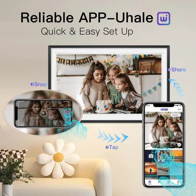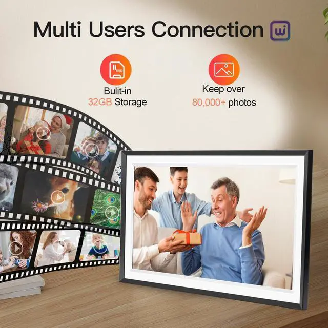 Simple setup: First download the "" application from the App Store and Google Store, open the electronic frame and find the wifi column in the settings to connect. After connecting, return to the initial page. Click anywhere on the screen and a "+" will appear ( Add friends), click "+" and a dedicated connection code will appear. Enter the code into App and you are done. You can ask your friends and family to download App.