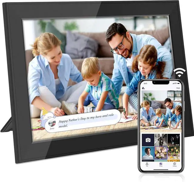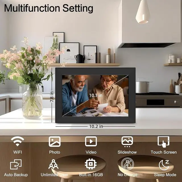 IMPRESSIVE FUNCTIONS 10.1 Wall mounted digital picture frame with WIFI instantly keep up with time, weather, photos, videos, slideshows. 1280*800 resolution IPS touch screen allows you to get a good visual effect from any angle. digital picture frame unlimited to add users, never charge for the software, automatic photo backup. Its a simple and trustworthy life helper!