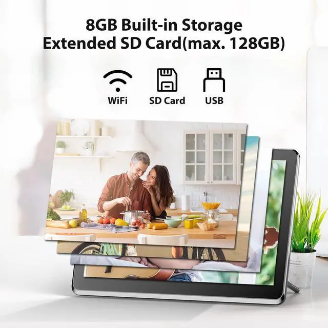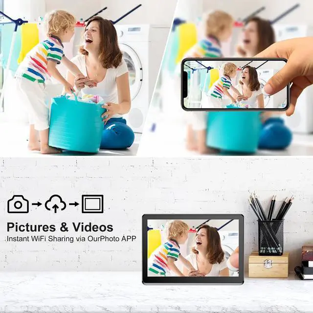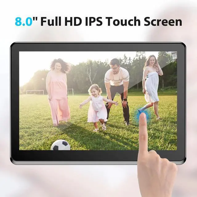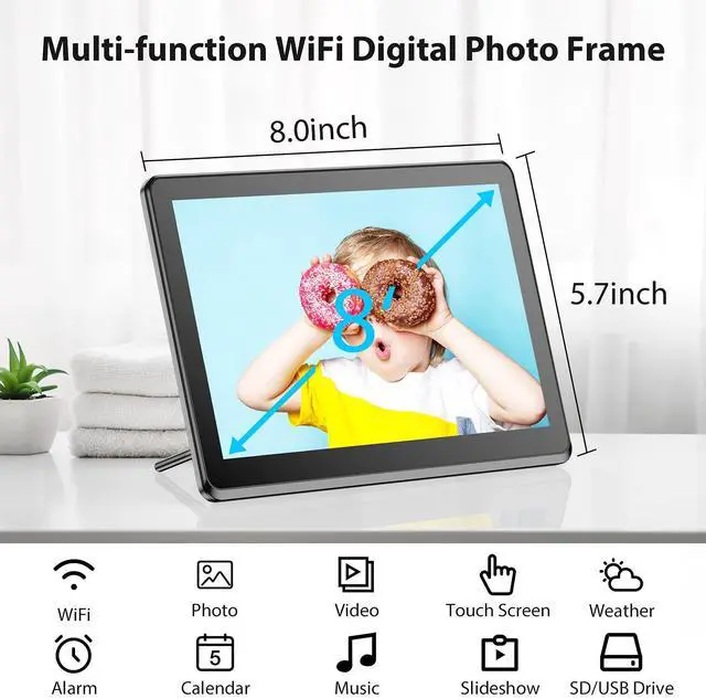 Touch Screen & Wireless Sharing: The 8 inch IPS WiFi digital photo frame with FHD 1920*1080 touch screen can display clear and crisp photos, which keep the memories alive. This digital picture frame support Wifi (2.4 GHz only). Photos and videos can be shared through APP (available for iOS and Android), Email, Facebook and twitter from anywhere.