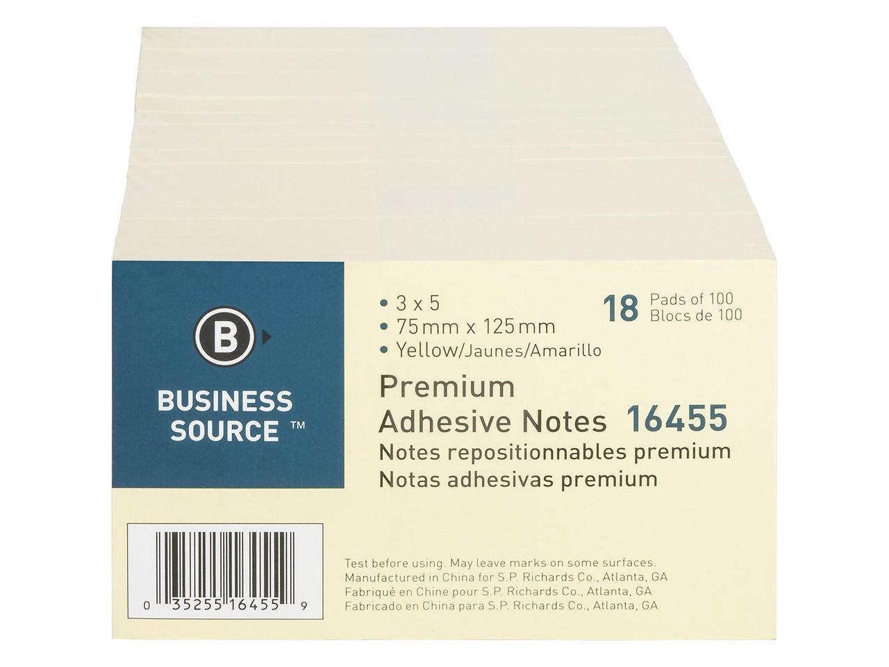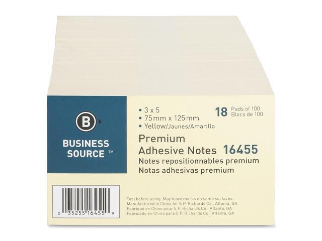 Business Source Adhesive Note Pads Plain 3"x5" 100 Sht/PD 18/PK Yellow 16455