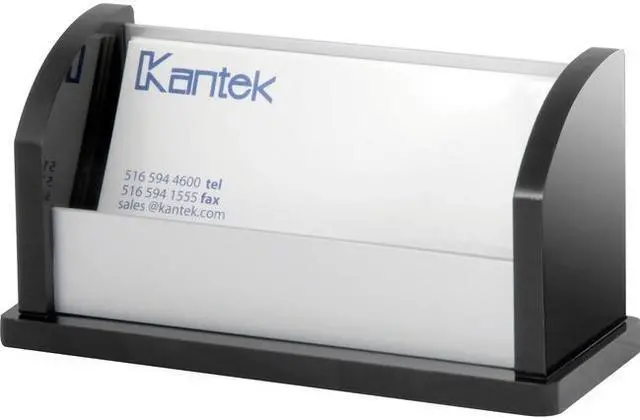 Business card holder accommodates up to 80 business cards. Angled open design offers easy access. Handcrafted desk accessory is made of acrylic and aluminum.