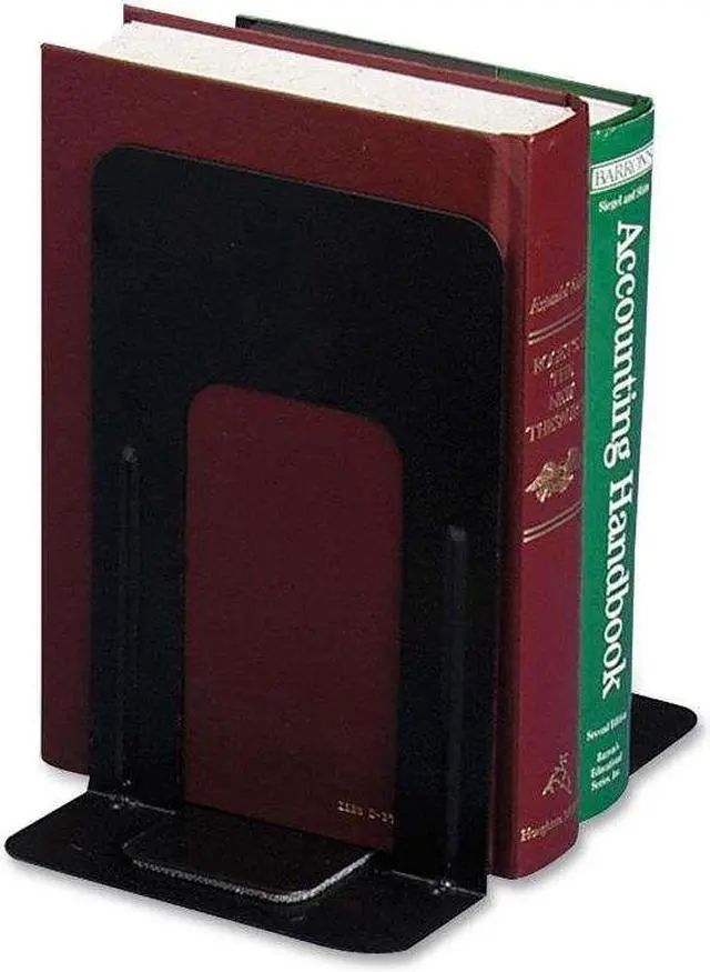 Officemate steel nonskid bookends keep you organized and support your books, binders, magazines and more with strength and stability. Features sturdy, steel ribbed construction with chip-proof enamel coating. Nonskid foam padding base keeps it in place and prevents from slipping and scratching. Material(s): Steel; Color(s): Black; Finish: Chip-Proof Enamel; Height: 9".