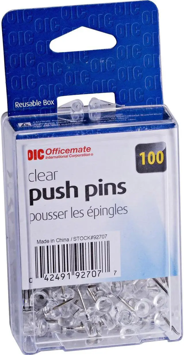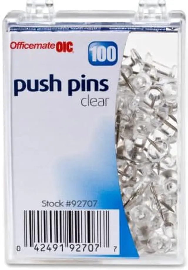 Hang documents and small items on walls, doors, and bulletin boards with this 100-pack of Officemate clear push pins.