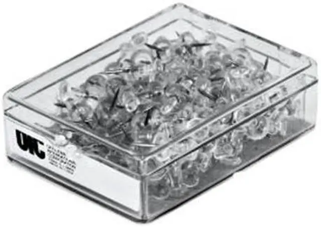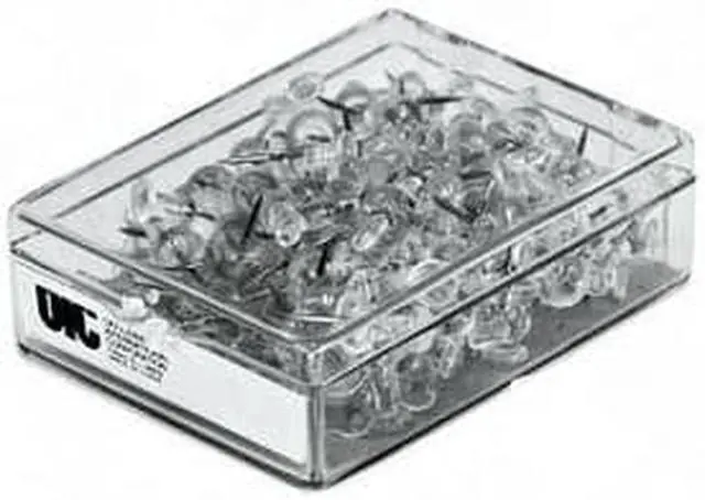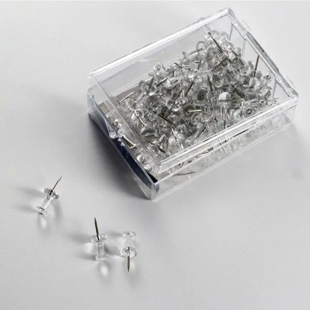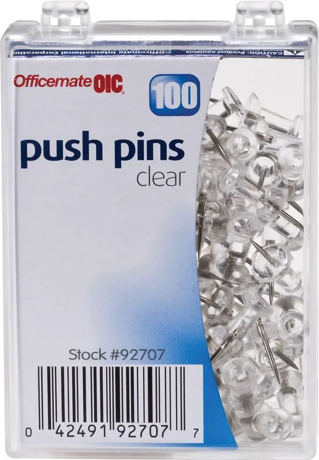 Place charts, notes, and reminders on cubicle walls and office bulletin boards with this 100-pack of clear push pins. Featuring sharp steel points, these push pins easily penetrate a variety of surfaces without bending or breaking and easily support the weight of a variety of small items. The 0.25-inch plastic heads make these Officemate clear push pins easy to remove and ensure hung items stay in place.
