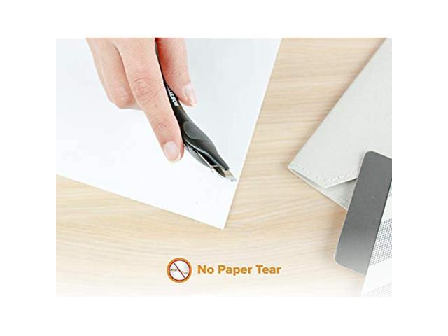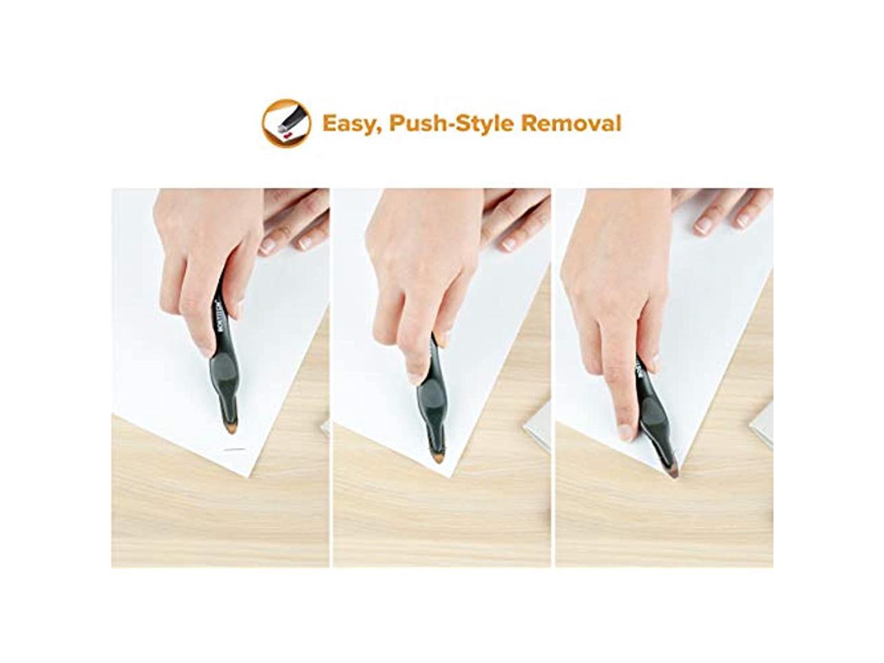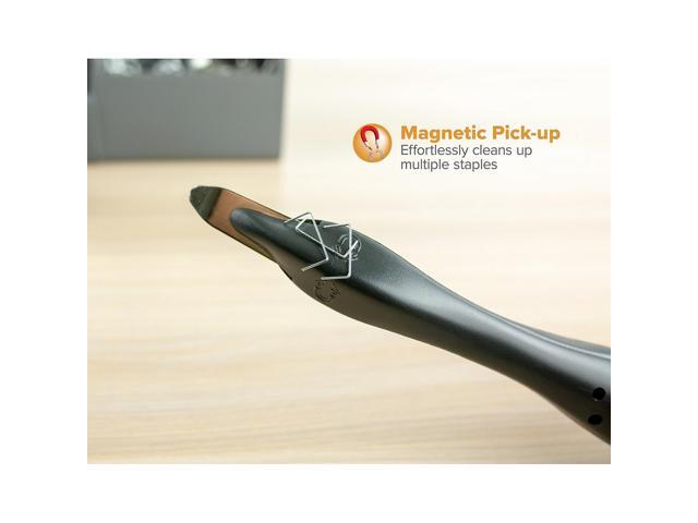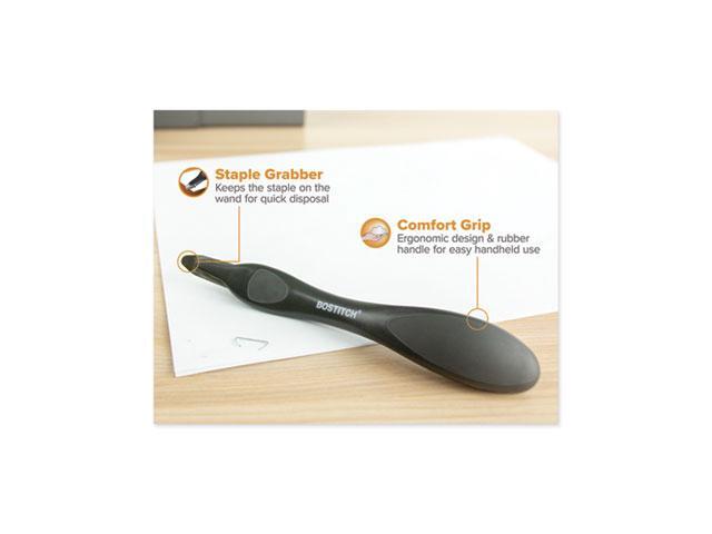 Magnetic staple remover with push mechanism allows for effortless staples removal. Staple grabber feature allows to keep the staple on the wand for quick disposal.