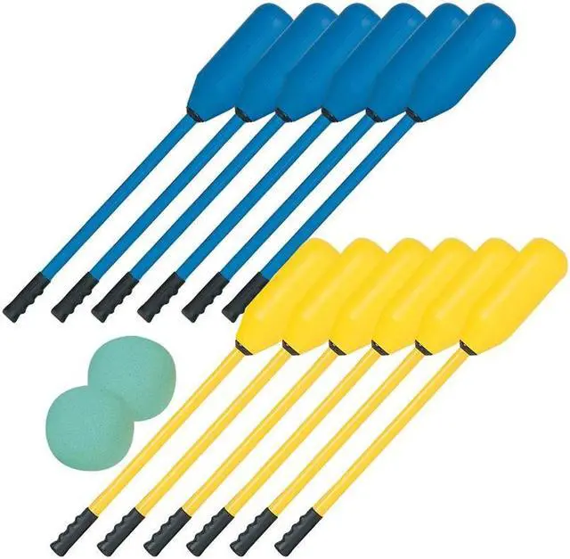 Great action game. The 24" long sticks have durable coated foam heads and long lasting hollow poly shafts. Set includes 12 sticks and two 7" foam balls.
