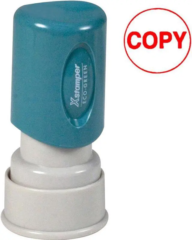 Xstamper Pre-Inked COPY Stamp - Message Stamp - "COPY" - 0.63" Impression Diameter - Red - Plastic Cap - Recycled - 1 Each Red ink COPY Stamp is pre-inked and re-inkable. Retractable frame keeps stamp surface away from desktop until ready to use. Plastic cap makes it safe to carry in purse or pocket. Impression size is 5/8" diameter.