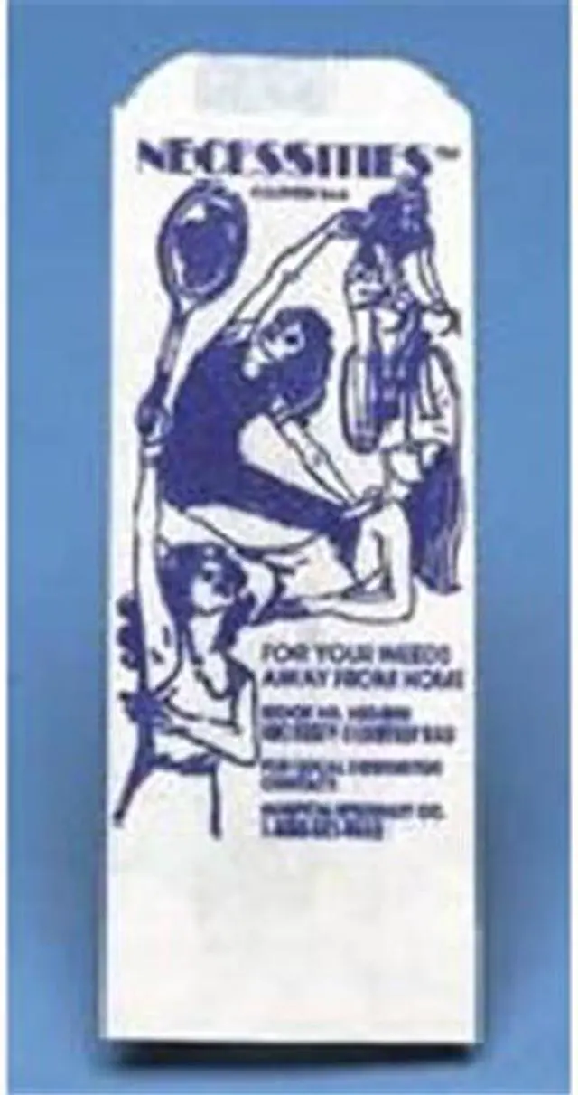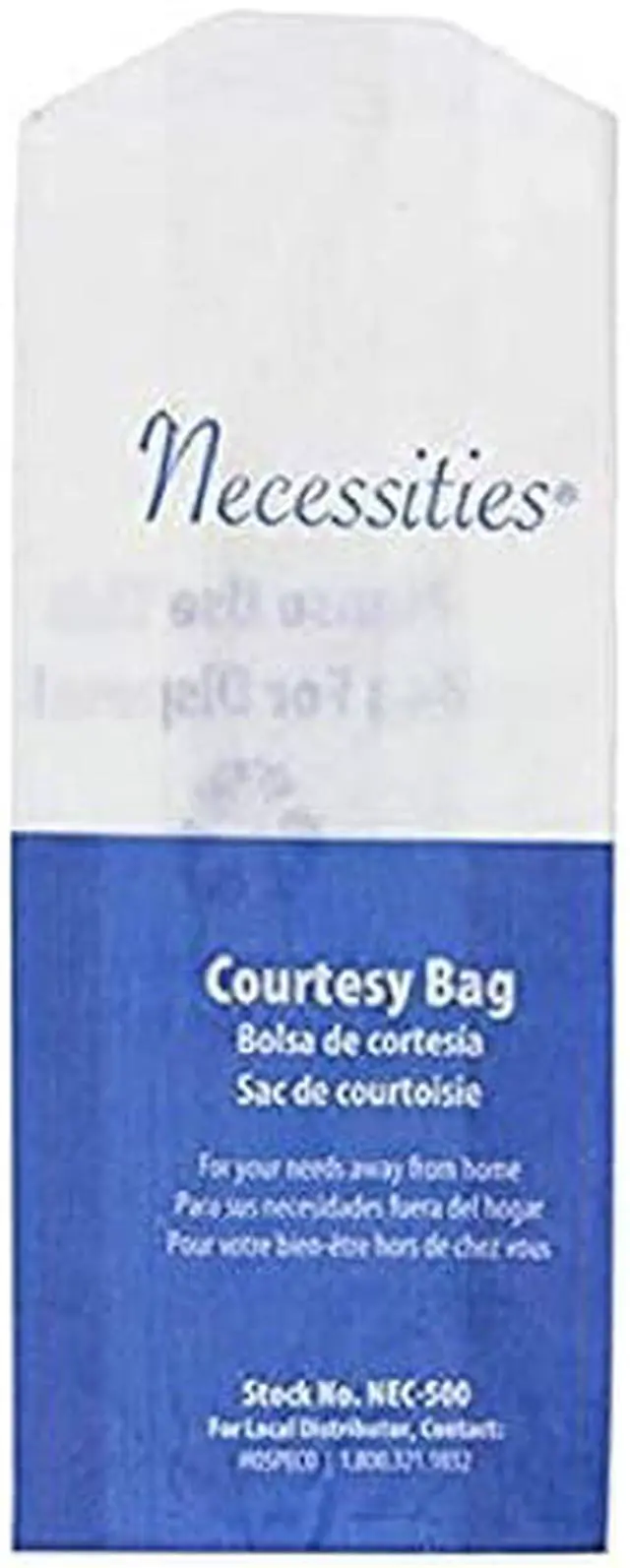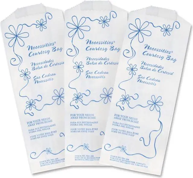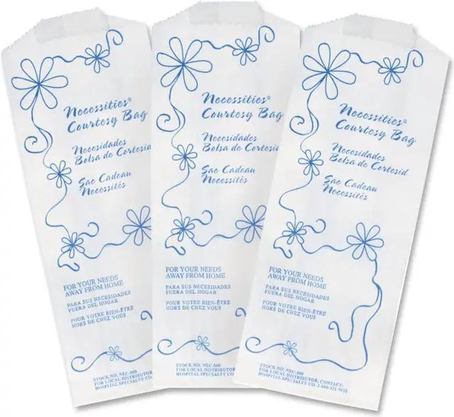 Conveniently sized bag for individual sanitary napkin disposal. Pleasantly decorated white paper with blue design. Application: Can Liner; Material(s): Paper; Depth: 2"; Width: 3".