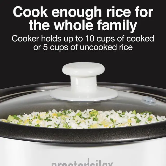 Simplify mealtime with the Proctor Silex 37533G 10 Cup Rice Cooker & Food Steamer. Ideal for families, this easy-to-use appliance cooks up to 10 cups of rice (5 cups uncooked) with one simple touch. It automatically switches to Keep Warm when the food is ready, so meals stay hot until youre ready to serve. The included steamer basket doubles as a rinsing colander, allowing you to prep and cook in one container. Perfect for rice, grains, vegetables, fish, and more, this cooker makes healthy eating easy. The nonstick removable bowl, glass lid, and accessories are dishwasher safe for effortless cleanup. With a 400-watt motor and compact design, the Proctor Silex 37533G delivers reliable performance, convenience, and durabilityall in one affordable kitchen appliance.
