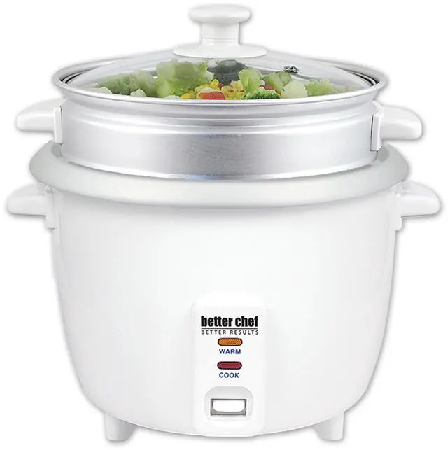 Designed for convenience, this rice cooker features a removable non-stick bowl that makes cleanup quick and simple. It automatically switches to a warming mode once cooking is complete, keeping rice warm and ready to serve for hours. A measuring cup and rice paddle are included for accurate portions and easy serving. Whether you're cooking long grain, wild, or specialty rice, the Better Chef Rice Cooker delivers consistent, delicious results for every meal.