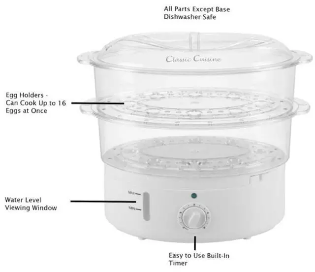This electric steamer is designed to steam vegetables, meat, and fish to perfection with no added fat required, preserving their nutrients and taste, while also cooking fluffy and evenly textured rice. With the included rice bowl and 2 steam trays, this 2-tier food steamer truly offers a wide range of cooking options. The built-in timer and included cooking guide eliminate guesswork for fast, easy meals.
