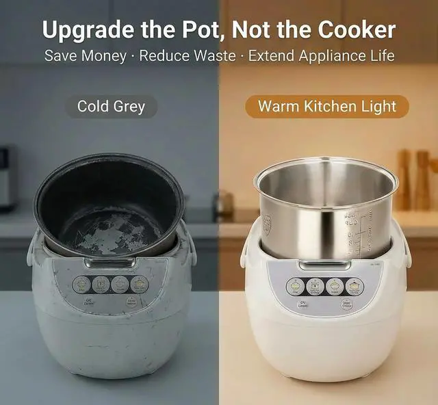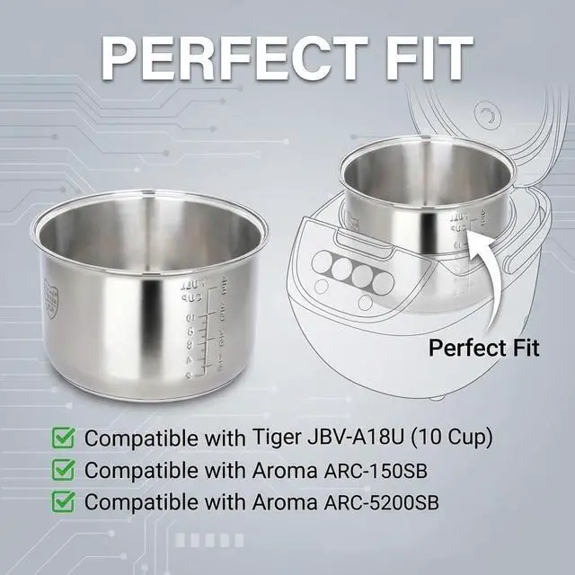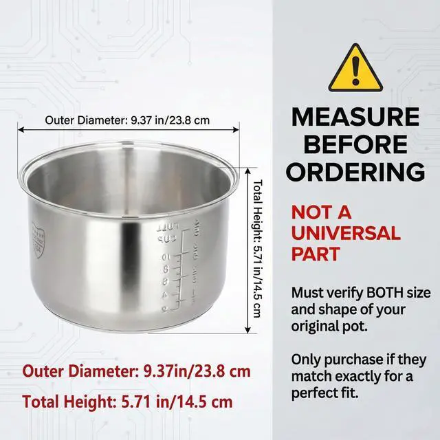 To ensure compatibility, measure the outer diameter (rim-to-rim) and overall height (rim-to-bottom) of your original inner pot, then compare its shape to yours. Check our size chart before ordering. Not universal — order only when both size and shape match.