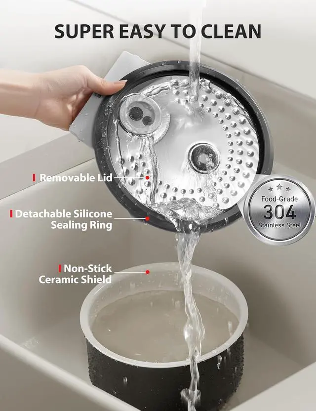 CONVENIENT MAINTENANCE: Removable steam vent cap and valve for thorough cleaning, with hand-washable non-stick inner pot for lasting performance.