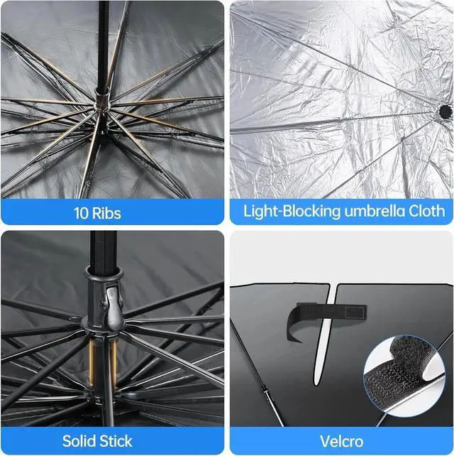 • Use High-Quality Materials--The car umbrella is designed with a three-fold chrome-plated black metal shaft and a strong metal frame. The ergonomic handle design maximizes comfort and holding safety. The sturdy frame and stable support ensure the durability of this car umbrella. keep your car in cool and comfortable condition in hot summer days.