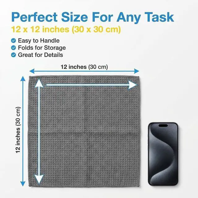 Discover the magic of effortless cleaning with FairyWaffle Microfiber Cleaning Cloths. This pack of 12 versatile cloth wipes, each measuring 12 x 12 inches, is designed to make your cleaning tasks easier, faster, and more effective. Whether you're polishing glasses, wiping screens, or dusting furniture, FairyWaffle delivers exceptional results every time.