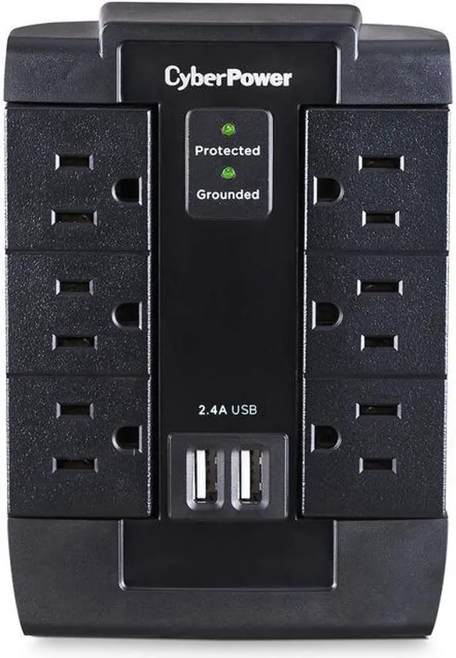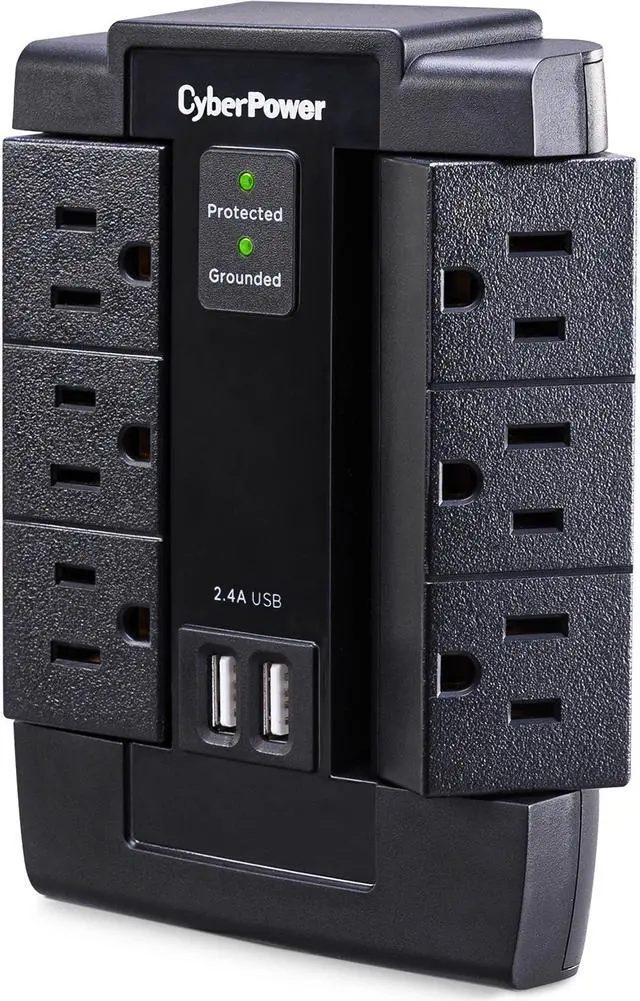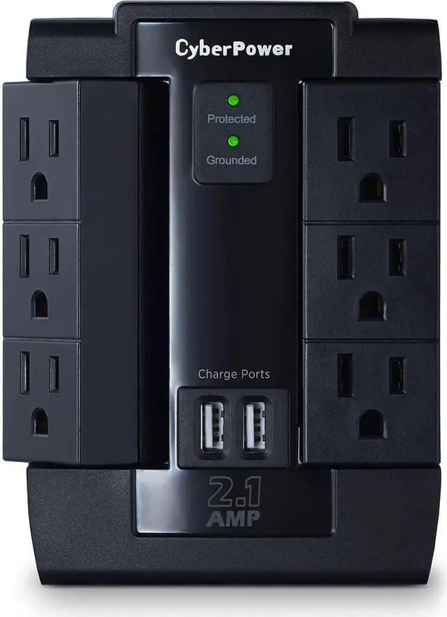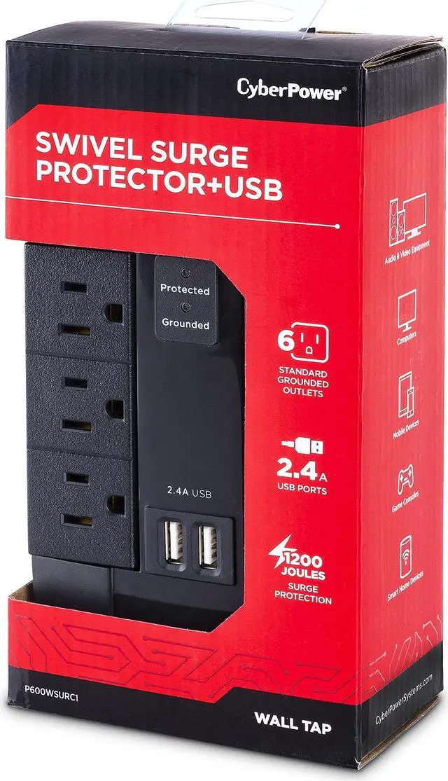 The CyberPower Home Office Surge Protector P600WSURC1 prevents spikes in energy caused by storms and electrical power surges from reaching your home office equipment such as laptops, small electronics, and chargers. The P600WSURC1 provides 1200 joules of protection and 6 AC outlets with a single wall tap plug. The two 2.1 -Amp USB ports quickly charge USB-powered devices, including tablets. Features of the P600WSURC1 include automatic shutdown, an EMI/RFI noise filter, metal oxide varistor (MOV) technology, surge protection LED indicator (Protected), damage-resistant housing, and an anchoring screw. Surge Protection Diverts excess voltage away from sensitive electronic equipment during an AC power surge or power spike to prevent damage.