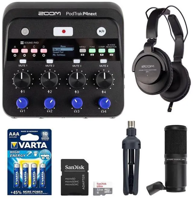The key to any great podcast is great soundand the Zoom PodTrak P4next makes it effortless. Packed with next-generation technology such as AI noise reduction, tone shaping, and built-in voice compression, the P4next delivers polished, broadcast-quality audio from the moment you hit record. Whether youre in the studio, on the road, or recording with remote guests, its your all-in-one tool for professional podcasting right out of the box. AI noise reduction learns and removes hums, buzzes, and street noise for clear, natural speech. Tone-shaping adds polish and warmth with EQ and de-essing, while the built-in compressor smooths sudden shouts, laughter, and whispers. Dedicated mic knobs, mute buttons, and backlit transport controls keep your mix balanced and easy to manage. Voice guidance provides audible menu descriptions, allowing effortless navigation without looking at the screen. Bundle with 32GB microSD card, Varta High-Energy 1.5V AA LR6 Alkaline Battery (4-Pack), ZDM-1 mic pack headphones and Tabletop Stand.