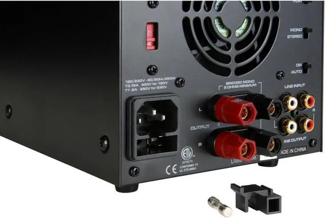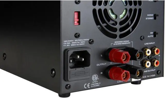 Connecting Your Loudspeakers for Bridged-Mono Operation 1. Set the Mono-Stereo switch to Mono position. 2. Remove approximately 1/2'' of insulation from your speaker cables' positive and negative conductors. 3. Loosen speaker binding posts by turning the knobs counter-clockwise, exposing the wire insert hole. 4. Connect positive conductor to top left binding post. 5. Connect negative conductor to bottom right binding post. Highlights Sleek modern design looks good and sounds great Virtually noise-free fan operation for near field applications High current, discrete output transistors that run cool and quiet