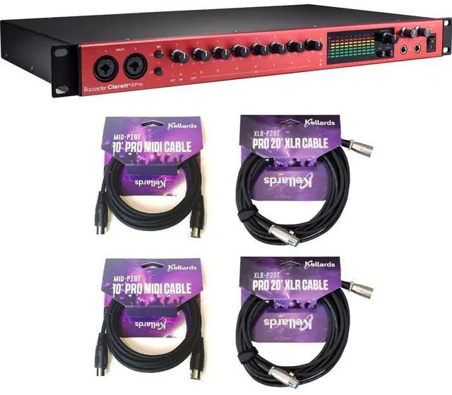 Equally comfortable in the studio or as part of a mobile rig, the Focusrite Clarett+ 8Pre rackmount 18x20 USB-C audio/MIDI interface combines upgraded 24-bit / 192 kHz AD/DA conversion with low-latency monitoring and eight Air-enabled microphone preamps that can model the sound of the company's classic ISA preamps. With low noise (-129 dB EIN), massive dynamic range, and even less distortion than before, the high-performance mic preamps deliver a clean, open, and transparent sound, for accurate reproduction of the original performance. In addition to the eight mic/line preamps (two with Hi-Z capability), the interface offers ADAT and S/PDIF I/O for digital input and output expansion, MIDI I/O for integration of MIDI equipment such as a keyboard or drum machine, and a BNC wordclock output for syncing other digital gear. Stereo monitor outputs, two headphone outs, and eight line outputs let you properly hook up monitors, headphones, and outboard processors. The Clarett+ 8Pre comes with a complete recording toolkit with Pro Tools Intro+, Ableton Live Lite, and Focusrite's Hitmaker Expansion software bundle; featuring Auto-Tune Access for Vocals, Softube Marshall Silver Jubilee 2555 for guitars, Native Instruments MASSIVE synth, and more. Bundle with Kellards MID-P10T Pro MIDI to MIDI Cable 10 Feet (2 Pack), Kellards XLR-P20T Pro 20 ft XLR Microphone Cable (2 Pack).