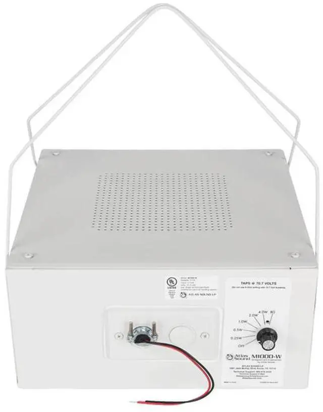 The exclusive AtlasIED EZ hang brackets simplify installation. This innovative suspension system utilizes collapsible plated hangers configured to allow quick upward, downward, or side firing installation. The hangers are factory-installed on the unit and fold flat for shipping. To meet most any local code requirement, the M1000-W includes an innovative cover containing both knockouts and a strain relief. This system will allow the use of rigid or flexible conduit (if required) and easily accommodates "through" connections on the removable plate. UL 2043 listed for use in air handling spaces.