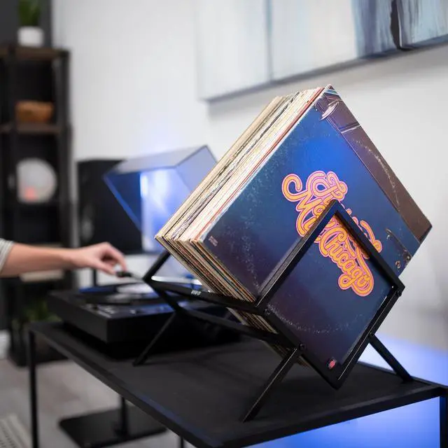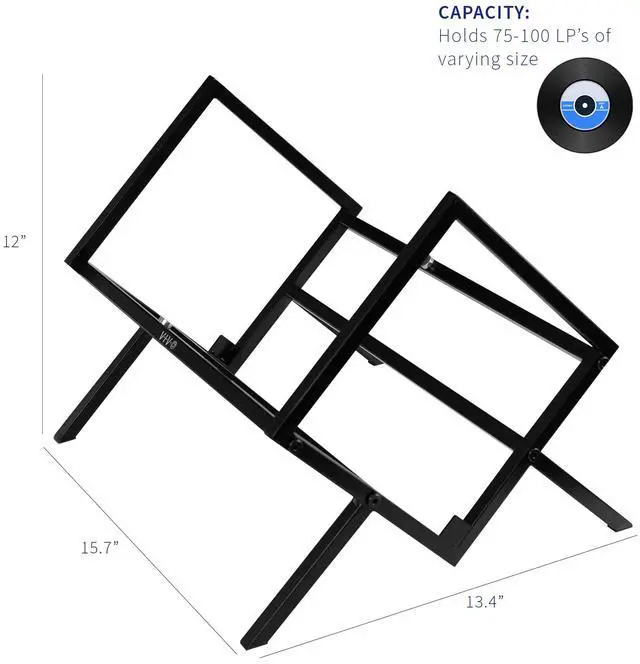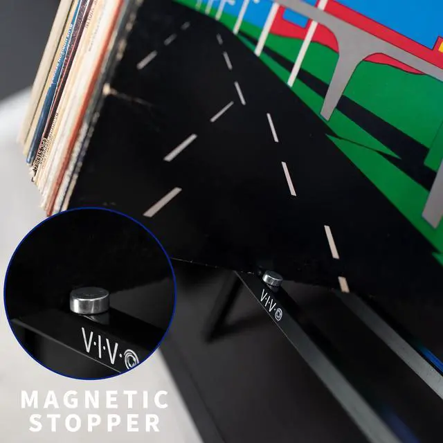 Organize your vinyl collection with the Black Vinyl Record Holder (STAND-VRH1B) from VIVO! The open-style rack adds a modern touch to your decor and provides ample space for your entire collection with room for up to 100 LPs. The slanted design makes flipping and separating albums easy with effortless removal when selecting a record. Included low profile magnetic stoppers provide solid stability when the rack is not at full capacity and also help organize albums. Easily view your collection with the racks open design with album artwork proudly displaying through the frame.