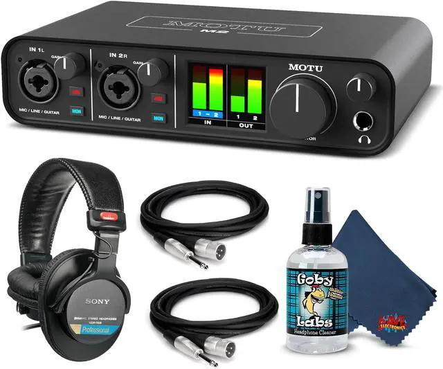 Equipped with the same ESS Sabre32 Ultra DAC Technology found in audio interfaces costing thousands, the M2 delivers an astonishing 120 dB Dynamic Range on its main outputs. ESS converters also drive the headphone output, which rivals dedicated headphone amplifiers costing hundreds. Ultra clean preamp circuits produce a measured -129 dBu EIN on the mic inputs. Capture and monitor your audio with pristine clarity. The M2 provides best in class speed for monitoring live inputs (mic, guitar or keyboard) through your computer, thanks to MOTU's expertly engineered USB drivers, which deliver class leading, ultra low 2.5 ms Round Trip Latency. When recording and mixing, nothing is more critical than achieving optimum levels. The M2 is the only audio interface in its class with a full color LCD featuring clear, detailed level meters for all inputs and outputs. Enjoy professional-level volume control and feedback to get your sound just right.