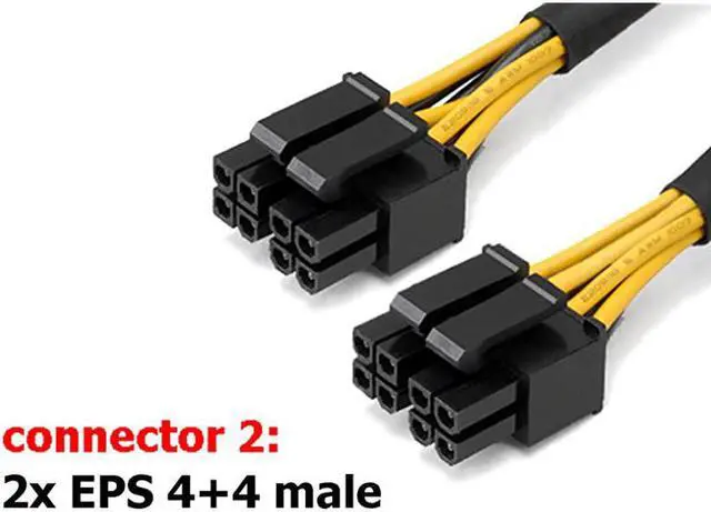 ***** **********Best Quality Guranteed. *****Connectors 1- standard CPU 8 pin EPS-12V female (connect to power supply 8 pin EPS). Connector 2 - 2x EPS-12V 8(4+4) pin male (connect to Motherboard 8(4+4) pin EPS)*****This cable splitter is designed ONLY for Motherboards with CPU 8 pin, CPU 8+4 pin or dual CPU 8 pin EPS 12V connectors. This will expand the capabilities of your power supply to meet higher demand - server & overclocking motherboards; *****A female end to connect to the CPU power connector of the power supply and two CPU male ends to plug into the Motherboard; *****Cable