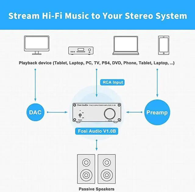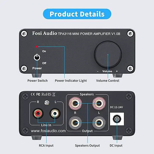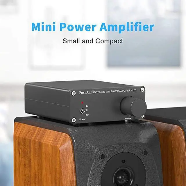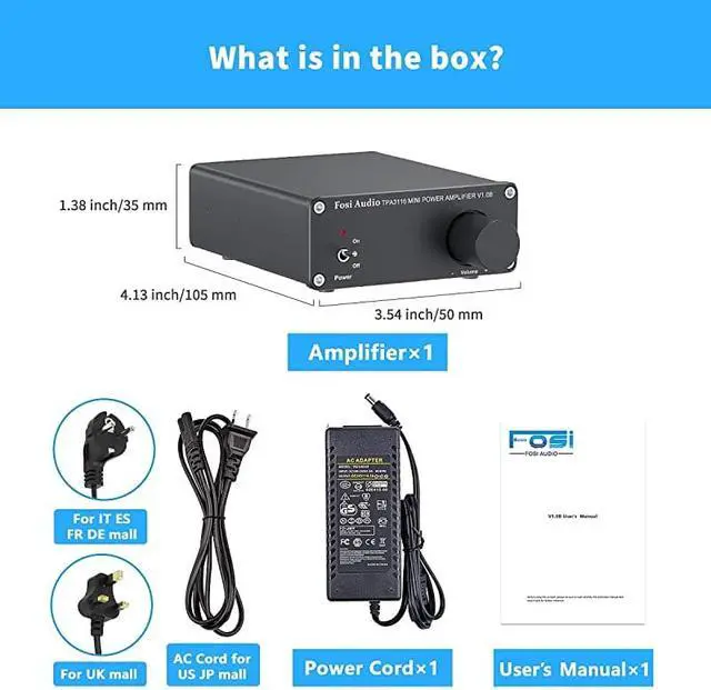 ***** **********Best Quality Guranteed. *****Rock SolidAdvanced circuitry design, built-in speakers protection circuit, solid aluminum chassis. *****DrivableConnect to your MP3/Phone/PC/Echo Dot as input, 50W x2(4 ohms, 20 Hz - 20 kHz, 0.04 % THD) can drive 2Ohm - 8Ohm speakers. *****High PerformanceHome Hi-Fi integrated amplifier, Exclusively designed for the customers who pursue HiFi sound. *****Excellent ChipAdopt TI TPA3116D2 chip to get clear and clarity sound, no audible noise, dead silent when nothing is playing through it. *****What' s Included? Come with V 1.0 Amplifier, Power supply, AC power cord, Manual and 18-month warranty.