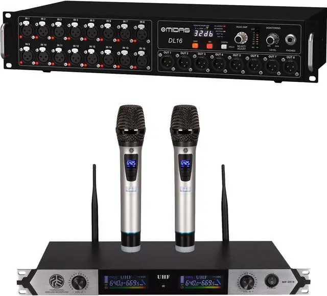 The MIDAS DL16, a digital I/O stage box with 16 remote-controlled Midas PRO preamplifiers as well as eight servo-balanced analog XLR outputs.