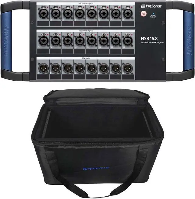 Designed to work seamlessly with PreSonus® StudioLive® Series III mixers, the PreSonus NSB 16.8 stage box offers 16 locking combo mic/line inputs with remote-controlled XMAX preamps that include gain compensation for shared input scenarios. You also get 16 direct inputs via AVB. All inputs can be controlled from a StudioLive Series III console and PreSonus Universal Control software. All eight outputs employ locking XLR jacks. A built in 2-port AVB switch lets you daisy-chain multiple units. A rugged steel chassis with sturdy handles and a stage box form factor allow the NSB 16.8 to sit well on the stage and survive the rigors of the road.