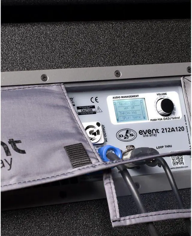 The rear panel features a balanced XLR input and thru-out as well as powerCON input and output, making power and audio daisy-chaining an easy affair. The DAScontrol audio management DSP is accessible via the built-in LCD / encoder and features Finite Impulse Response (FIR) filters, which provide a linear phase response and a precise impulse response. The DAScontrol interface offers quick and hassle-free setup of systems in arrays and easy alignment with EVENT-218A and EVENT-121A subwoofer systems. Presets for the number of units of the array, high-frequency compensation for throw distances, and correction for the splay angle of the array can be selected by way of the DAScontrol and LCD screen.