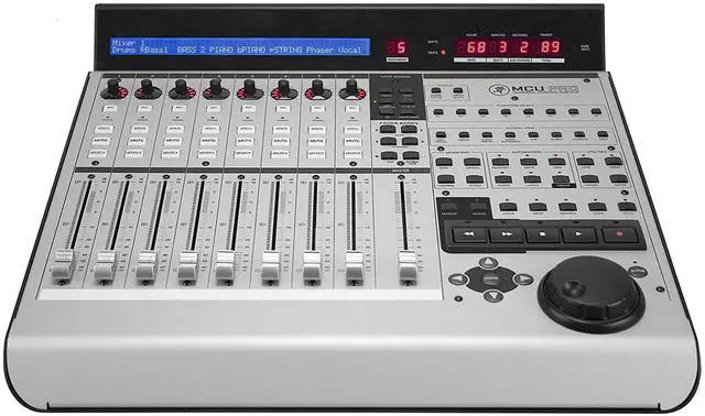 The Mackie MCU Pro is a 9-fader (eight channels plus one master) USB/MIDI control surface that provides mixing, editing, automation, and navigational control for any supported digital audio workstation. It supports Mackie Control, HUI, and Logic Control modes to allow it to communicate with various software applications. Connect the MCU Pro to your computer via USB or MIDI.
