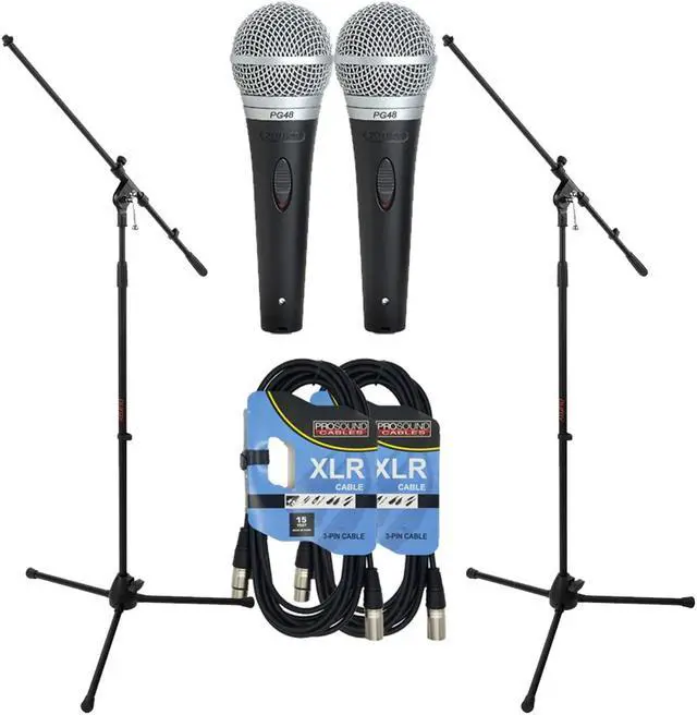 • (2) Shure PG48 VOCAL MICROPHONE WITH MIC STAND AND CABLE PACKAGE